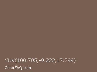 YUV 100.705,-9.222,17.799 Color is a normal orange color and the nearest color is Roman Coffee #795d4c. Hex code #795e52 and RGB value is rgb(121,94,82). In RGB color space, this color is composed of 47% red, 37% green, 32% blue, In CMYK color space, this color is composed of 0% cyan, 22% magenta, 32% yellow , 53% black , In HSL color space, this color has a hue angle of 18° , 19% saturation and 40% lightness.