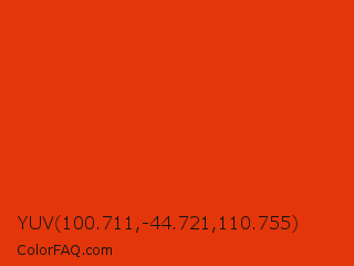 YUV 100.711,-44.721,110.755 Color is a normal red color and the nearest color is Vermilion #d9381e. Hex code #e3360a and RGB value is rgb(227,54,10). In RGB color space, this color is composed of 89% red, 21% green, 4% blue, In CMYK color space, this color is composed of 0% cyan, 76% magenta, 96% yellow , 11% black , In HSL color space, this color has a hue angle of 12° , 92% saturation and 46% lightness.