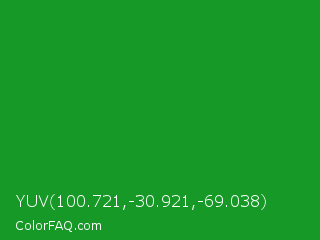 YUV 100.721,-30.921,-69.038 Color is a normal green color and the nearest color is Forest Green #228b22. Hex code #169926 and RGB value is rgb(22,153,38). In RGB color space, this color is composed of 9% red, 60% green, 15% blue, In CMYK color space, this color is composed of 86% cyan, 0% magenta, 75% yellow , 40% black , In HSL color space, this color has a hue angle of 127° , 75% saturation and 34% lightness.