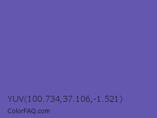 YUV 100.734,37.106,-1.521 Color is a normal indigo color and the nearest color is Blue Violet #6456b7. Hex code #6357b0 and RGB value is rgb(99,87,176). In RGB color space, this color is composed of 39% red, 34% green, 69% blue, In CMYK color space, this color is composed of 44% cyan, 51% magenta, 0% yellow , 31% black , In HSL color space, this color has a hue angle of 248° , 36% saturation and 52% lightness.