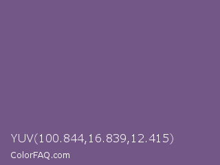 YUV 100.844,16.839,12.415 Color is a normal purple color and the nearest color is Dark Lavender #734f96. Hex code #735787 and RGB value is rgb(115,87,135). In RGB color space, this color is composed of 45% red, 34% green, 53% blue, In CMYK color space, this color is composed of 15% cyan, 36% magenta, 0% yellow , 47% black , In HSL color space, this color has a hue angle of 275° , 22% saturation and 44% lightness.