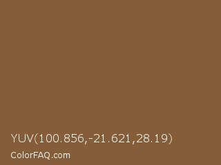 YUV 100.856,-21.621,28.19 Color is a normal orange color and the nearest color is Coyote Brown #81613c. Hex code #855d39 and RGB value is rgb(133,93,57). In RGB color space, this color is composed of 52% red, 36% green, 22% blue, In CMYK color space, this color is composed of 0% cyan, 30% magenta, 57% yellow , 48% black , In HSL color space, this color has a hue angle of 28° , 40% saturation and 37% lightness.