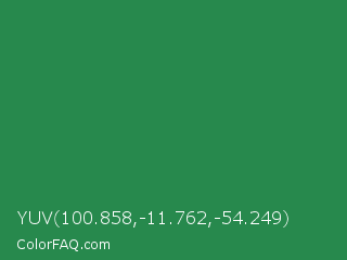 YUV 100.858,-11.762,-54.249 Color is a normal green color and the nearest color is Sea Green #2e8b57. Hex code #27894d and RGB value is rgb(39,137,77). In RGB color space, this color is composed of 15% red, 54% green, 30% blue, In CMYK color space, this color is composed of 72% cyan, 0% magenta, 44% yellow , 46% black , In HSL color space, this color has a hue angle of 143° , 56% saturation and 35% lightness.