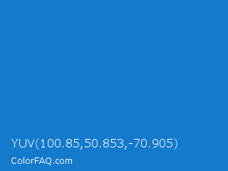 YUV 100.85,50.853,-70.905 Color is a normal blue color and the nearest color is Bright Navy Blue #1974d2. Hex code #147acc and RGB value is rgb(20,122,204). In RGB color space, this color is composed of 8% red, 48% green, 80% blue, In CMYK color space, this color is composed of 90% cyan, 40% magenta, 0% yellow , 20% black , In HSL color space, this color has a hue angle of 207° , 82% saturation and 44% lightness.