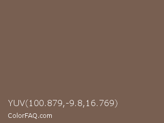 YUV 100.879,-9.8,16.769 Color is a normal orange color and the nearest color is Roman Coffee #795d4c. Hex code #785f51 and RGB value is rgb(120,95,81). In RGB color space, this color is composed of 47% red, 37% green, 32% blue, In CMYK color space, this color is composed of 0% cyan, 21% magenta, 33% yellow , 53% black , In HSL color space, this color has a hue angle of 22° , 19% saturation and 39% lightness.
