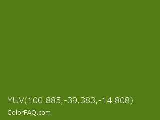 YUV 100.885,-39.383,-14.808 Color is a dark green color and the nearest color is Avocado #568203. Hex code #547d15 and RGB value is rgb(84,125,21). In RGB color space, this color is composed of 33% red, 49% green, 8% blue, In CMYK color space, this color is composed of 33% cyan, 0% magenta, 83% yellow , 51% black , In HSL color space, this color has a hue angle of 84° , 71% saturation and 29% lightness.