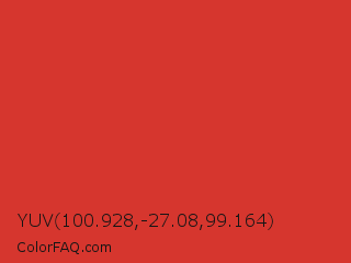 YUV 100.928,-27.08,99.164 Color is a normal red color and the nearest color is Persian Red #cc3333. Hex code #d6362e and RGB value is rgb(214,54,46). In RGB color space, this color is composed of 84% red, 21% green, 18% blue, In CMYK color space, this color is composed of 0% cyan, 75% magenta, 79% yellow , 16% black , In HSL color space, this color has a hue angle of 3° , 67% saturation and 51% lightness.