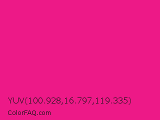 YUV 100.928,16.797,119.335 Color is a normal rose color and the nearest color is Barbie Pink #e0218a. Hex code #ed1987 and RGB value is rgb(237,25,135). In RGB color space, this color is composed of 93% red, 10% green, 53% blue, In CMYK color space, this color is composed of 0% cyan, 89% magenta, 43% yellow , 7% black , In HSL color space, this color has a hue angle of 329° , 85% saturation and 51% lightness.
