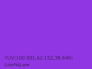 YUV 100.931,62.152,38.649 Color is a normal purple color and the nearest color is Blue Violet #8a2be2. Hex code #9136e3 and RGB value is rgb(145,54,227). In RGB color space, this color is composed of 57% red, 21% green, 89% blue, In CMYK color space, this color is composed of 36% cyan, 76% magenta, 0% yellow , 11% black , In HSL color space, this color has a hue angle of 272° , 76% saturation and 55% lightness.