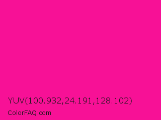 YUV 100.932,24.191,128.102 Color is a normal magenta color and the nearest color is Fluorescent Pink #ff1493. Hex code #f71196 and RGB value is rgb(247,17,150). In RGB color space, this color is composed of 97% red, 7% green, 59% blue, In CMYK color space, this color is composed of 0% cyan, 93% magenta, 39% yellow , 3% black , In HSL color space, this color has a hue angle of 325° , 93% saturation and 52% lightness.