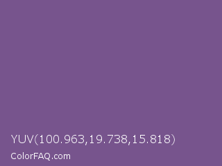 YUV 100.963,19.738,15.818 Color is a normal purple color and the nearest color is Dark Lavender #734f96. Hex code #77548d and RGB value is rgb(119,84,141). In RGB color space, this color is composed of 47% red, 33% green, 55% blue, In CMYK color space, this color is composed of 16% cyan, 40% magenta, 0% yellow , 45% black , In HSL color space, this color has a hue angle of 277° , 25% saturation and 44% lightness.