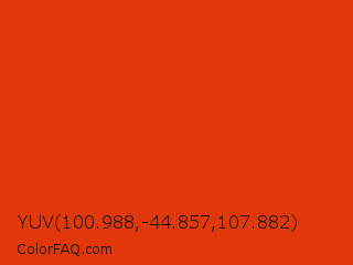 YUV 100.988,-44.857,107.882 Color is a normal red color and the nearest color is Grenadier #d54600. Hex code #e0380a and RGB value is rgb(224,56,10). In RGB color space, this color is composed of 88% red, 22% green, 4% blue, In CMYK color space, this color is composed of 0% cyan, 75% magenta, 96% yellow , 12% black , In HSL color space, this color has a hue angle of 13° , 91% saturation and 46% lightness.