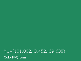 YUV 101.002,-3.452,-59.638 Color is a normal green color and the nearest color is Eucalyptus #278a5b. Hex code #21895e and RGB value is rgb(33,137,94). In RGB color space, this color is composed of 13% red, 54% green, 37% blue, In CMYK color space, this color is composed of 76% cyan, 0% magenta, 31% yellow , 46% black , In HSL color space, this color has a hue angle of 155° , 61% saturation and 33% lightness.