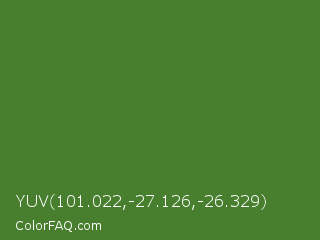 YUV 101.022,-27.126,-26.329 Color is a normal green color and the nearest color is Sap Green #507d2a. Hex code #477f2e and RGB value is rgb(71,127,46). In RGB color space, this color is composed of 28% red, 50% green, 18% blue, In CMYK color space, this color is composed of 44% cyan, 0% magenta, 64% yellow , 50% black , In HSL color space, this color has a hue angle of 101° , 47% saturation and 34% lightness.