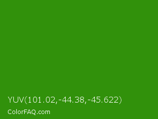 YUV 101.02,-44.38,-45.622 Color is a normal green color and the nearest color is Slimy Green #299617. Hex code #31910b and RGB value is rgb(49,145,11). In RGB color space, this color is composed of 19% red, 57% green, 4% blue, In CMYK color space, this color is composed of 66% cyan, 0% magenta, 92% yellow , 43% black , In HSL color space, this color has a hue angle of 103° , 86% saturation and 31% lightness.