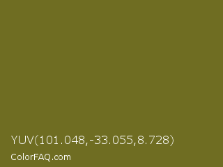 YUV 101.048,-33.055,8.728 Color is a dark yellow color and the nearest color is Fern Frond #657220. Hex code #6f6d22 and RGB value is rgb(111,109,34). In RGB color space, this color is composed of 44% red, 43% green, 13% blue, In CMYK color space, this color is composed of 0% cyan, 2% magenta, 69% yellow , 56% black , In HSL color space, this color has a hue angle of 58° , 53% saturation and 28% lightness.
