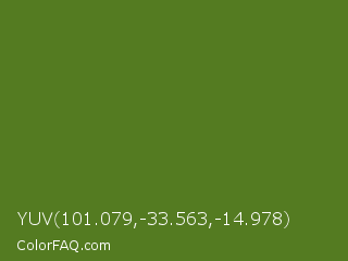 YUV 101.079,-33.563,-14.978 Color is a normal green color and the nearest color is Sap Green #507d2a. Hex code #547b21 and RGB value is rgb(84,123,33). In RGB color space, this color is composed of 33% red, 48% green, 13% blue, In CMYK color space, this color is composed of 32% cyan, 0% magenta, 73% yellow , 52% black , In HSL color space, this color has a hue angle of 86° , 58% saturation and 31% lightness.