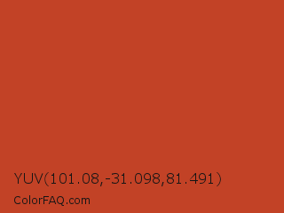 YUV 101.08,-31.098,81.491 Color is a normal red color and the nearest color is Dark Pastel Red #c23b22. Hex code #c24226 and RGB value is rgb(194,66,38). In RGB color space, this color is composed of 76% red, 26% green, 15% blue, In CMYK color space, this color is composed of 0% cyan, 66% magenta, 80% yellow , 24% black , In HSL color space, this color has a hue angle of 11° , 67% saturation and 45% lightness.