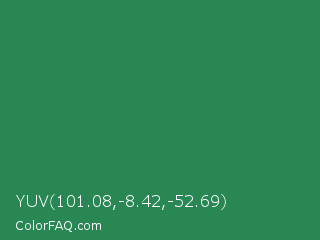 YUV 101.08,-8.42,-52.69 Color is a normal green color and the nearest color is Sea Green #2e8b57. Hex code #298754 and RGB value is rgb(41,135,84). In RGB color space, this color is composed of 16% red, 53% green, 33% blue, In CMYK color space, this color is composed of 70% cyan, 0% magenta, 38% yellow , 47% black , In HSL color space, this color has a hue angle of 147° , 53% saturation and 35% lightness.