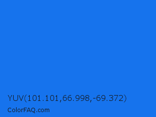 YUV 101.101,66.998,-69.372 Color is a normal blue color and the nearest color is Blue Crayola #1f75fe. Hex code #1673ed and RGB value is rgb(22,115,237). In RGB color space, this color is composed of 9% red, 45% green, 93% blue, In CMYK color space, this color is composed of 91% cyan, 51% magenta, 0% yellow , 7% black , In HSL color space, this color has a hue angle of 214° , 86% saturation and 51% lightness.