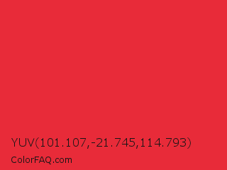 YUV 101.107,-21.745,114.793 Color is a normal red color and the nearest color is Imperial Red #ed2939. Hex code #e82b39 and RGB value is rgb(232,43,57). In RGB color space, this color is composed of 91% red, 17% green, 22% blue, In CMYK color space, this color is composed of 0% cyan, 81% magenta, 75% yellow , 9% black , In HSL color space, this color has a hue angle of 356° , 80% saturation and 54% lightness.