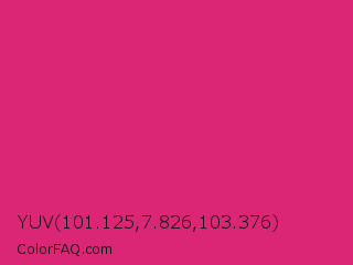 YUV 101.125,7.826,103.376 Color is a normal rose color and the nearest color is Razzmatazz #e3256b. Hex code #db2675 and RGB value is rgb(219,38,117). In RGB color space, this color is composed of 86% red, 15% green, 46% blue, In CMYK color space, this color is composed of 0% cyan, 83% magenta, 47% yellow , 14% black , In HSL color space, this color has a hue angle of 334° , 72% saturation and 50% lightness.
