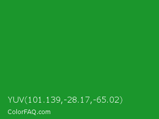 YUV 101.139,-28.17,-65.02 Color is a normal green color and the nearest color is Forest Green #228b22. Hex code #1b962c and RGB value is rgb(27,150,44). In RGB color space, this color is composed of 11% red, 59% green, 17% blue, In CMYK color space, this color is composed of 82% cyan, 0% magenta, 71% yellow , 41% black , In HSL color space, this color has a hue angle of 128° , 69% saturation and 35% lightness.