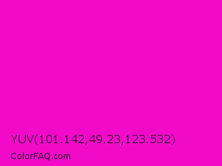 YUV 101.142,49.23,123.532 Color is a normal magenta color and the nearest color is Shocking Pink #fc0fc0. Hex code #f20ac9 and RGB value is rgb(242,10,201). In RGB color space, this color is composed of 95% red, 4% green, 79% blue, In CMYK color space, this color is composed of 0% cyan, 96% magenta, 17% yellow , 5% black , In HSL color space, this color has a hue angle of 311° , 92% saturation and 49% lightness.