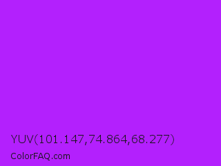 YUV 101.147,74.864,68.277 Color is a normal purple color and the nearest color is Veronica #a020f0. Hex code #b320fd and RGB value is rgb(179,32,253). In RGB color space, this color is composed of 70% red, 13% green, 99% blue, In CMYK color space, this color is composed of 29% cyan, 87% magenta, 0% yellow , 1% black , In HSL color space, this color has a hue angle of 280° , 98% saturation and 56% lightness.