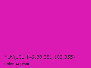 YUV 101.149,38.381,103.355 Color is a normal magenta color and the nearest color is Frostbite #e936a7. Hex code #db1ab3 and RGB value is rgb(219,26,179). In RGB color space, this color is composed of 86% red, 10% green, 70% blue, In CMYK color space, this color is composed of 0% cyan, 88% magenta, 18% yellow , 14% black , In HSL color space, this color has a hue angle of 312° , 79% saturation and 48% lightness.
