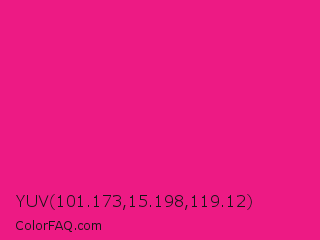 YUV 101.173,15.198,119.12 Color is a normal rose color and the nearest color is Barbie Pink #e0218a. Hex code #ed1a84 and RGB value is rgb(237,26,132). In RGB color space, this color is composed of 93% red, 10% green, 52% blue, In CMYK color space, this color is composed of 0% cyan, 89% magenta, 44% yellow , 7% black , In HSL color space, this color has a hue angle of 330° , 85% saturation and 52% lightness.