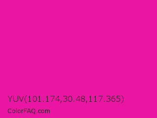 YUV 101.174,30.48,117.365 Color is a normal magenta color and the nearest color is Hollywood Cerise #f400a1. Hex code #eb15a3 and RGB value is rgb(235,21,163). In RGB color space, this color is composed of 92% red, 8% green, 64% blue, In CMYK color space, this color is composed of 0% cyan, 91% magenta, 31% yellow , 8% black , In HSL color space, this color has a hue angle of 320° , 84% saturation and 50% lightness.