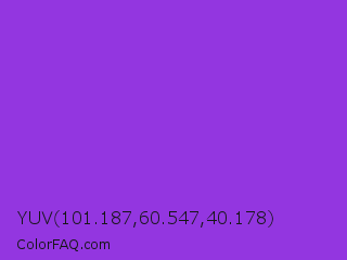 YUV 101.187,60.547,40.178 Color is a normal purple color and the nearest color is Blue Violet #8a2be2. Hex code #9336e0 and RGB value is rgb(147,54,224). In RGB color space, this color is composed of 58% red, 21% green, 88% blue, In CMYK color space, this color is composed of 34% cyan, 76% magenta, 0% yellow , 12% black , In HSL color space, this color has a hue angle of 273° , 73% saturation and 55% lightness.