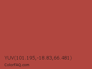 YUV 101.195,-18.83,66.481 Color is a normal red color and the nearest color is Apple Blossom #af4d43. Hex code #b1463f and RGB value is rgb(177,70,63). In RGB color space, this color is composed of 69% red, 27% green, 25% blue, In CMYK color space, this color is composed of 0% cyan, 60% magenta, 64% yellow , 31% black , In HSL color space, this color has a hue angle of 4° , 48% saturation and 47% lightness.