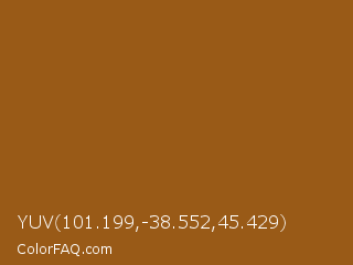 YUV 101.199,-38.552,45.429 Color is a normal orange color and the nearest color is Hawaiian Tan #9d5616. Hex code #995a17 and RGB value is rgb(153,90,23). In RGB color space, this color is composed of 60% red, 35% green, 9% blue, In CMYK color space, this color is composed of 0% cyan, 41% magenta, 85% yellow , 40% black , In HSL color space, this color has a hue angle of 31° , 74% saturation and 35% lightness.