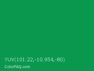 YUV 101.22,-10.954,-80 Color is a normal green color and the nearest color is Spanish Green #009150. Hex code #0a984f and RGB value is rgb(10,152,79). In RGB color space, this color is composed of 4% red, 60% green, 31% blue, In CMYK color space, this color is composed of 93% cyan, 0% magenta, 48% yellow , 40% black , In HSL color space, this color has a hue angle of 149° , 88% saturation and 32% lightness.