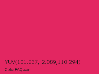 YUV 101.237,-2.089,110.294 Color is a normal rose color and the nearest color is Razzmatazz #e3256b. Hex code #e32661 and RGB value is rgb(227,38,97). In RGB color space, this color is composed of 89% red, 15% green, 38% blue, In CMYK color space, this color is composed of 0% cyan, 83% magenta, 57% yellow , 11% black , In HSL color space, this color has a hue angle of 341° , 77% saturation and 52% lightness.