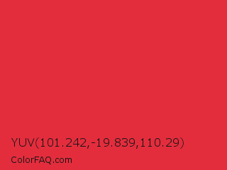YUV 101.242,-19.839,110.29 Color is a normal red color and the nearest color is Alizarin Crimson #e32636. Hex code #e32d3d and RGB value is rgb(227,45,61). In RGB color space, this color is composed of 89% red, 18% green, 24% blue, In CMYK color space, this color is composed of 0% cyan, 80% magenta, 73% yellow , 11% black , In HSL color space, this color has a hue angle of 355° , 76% saturation and 53% lightness.