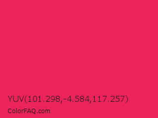 YUV 101.298,-4.584,117.257 Color is a normal rose color and the nearest color is Red Crayola #ee204d. Hex code #eb235c and RGB value is rgb(235,35,92). In RGB color space, this color is composed of 92% red, 14% green, 36% blue, In CMYK color space, this color is composed of 0% cyan, 85% magenta, 61% yellow , 8% black , In HSL color space, this color has a hue angle of 343° , 83% saturation and 53% lightness.