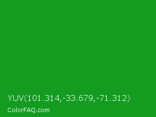 YUV 101.314,-33.679,-71.312 Color is a normal green color and the nearest color is Forest Green #228b22. Hex code #149c21 and RGB value is rgb(20,156,33). In RGB color space, this color is composed of 8% red, 61% green, 13% blue, In CMYK color space, this color is composed of 87% cyan, 0% magenta, 79% yellow , 39% black , In HSL color space, this color has a hue angle of 126° , 77% saturation and 35% lightness.