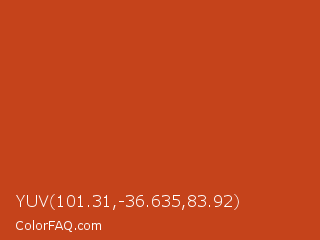 YUV 101.31,-36.635,83.92 Color is a normal red color and the nearest color is Dark Pastel Red #c23b22. Hex code #c5431b and RGB value is rgb(197,67,27). In RGB color space, this color is composed of 77% red, 26% green, 11% blue, In CMYK color space, this color is composed of 0% cyan, 66% magenta, 86% yellow , 23% black , In HSL color space, this color has a hue angle of 14° , 76% saturation and 44% lightness.