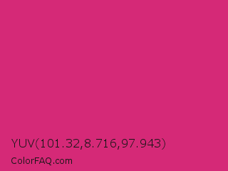 YUV 101.32,8.716,97.943 Color is a normal rose color and the nearest color is Telemagenta #cf3476. Hex code #d52977 and RGB value is rgb(213,41,119). In RGB color space, this color is composed of 84% red, 16% green, 47% blue, In CMYK color space, this color is composed of 0% cyan, 81% magenta, 44% yellow , 16% black , In HSL color space, this color has a hue angle of 333° , 68% saturation and 50% lightness.