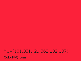 YUV 101.331,-21.362,132.137 Color is a normal red color and the nearest color is Imperial Red #ed2939. Hex code #fc213a and RGB value is rgb(252,33,58). In RGB color space, this color is composed of 99% red, 13% green, 23% blue, In CMYK color space, this color is composed of 0% cyan, 87% magenta, 77% yellow , 1% black , In HSL color space, this color has a hue angle of 353° , 97% saturation and 56% lightness.