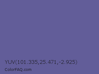 YUV 101.335,25.471,-2.925 Color is a normal indigo color and the nearest color is Dark Blue Gray #666699. Hex code #625d99 and RGB value is rgb(98,93,153). In RGB color space, this color is composed of 38% red, 36% green, 60% blue, In CMYK color space, this color is composed of 36% cyan, 39% magenta, 0% yellow , 40% black , In HSL color space, this color has a hue angle of 245° , 24% saturation and 48% lightness.