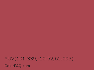YUV 101.339,-10.52,61.093 Color is a normal red color and the nearest color is English Red #ab4b52. Hex code #ab4650 and RGB value is rgb(171,70,80). In RGB color space, this color is composed of 67% red, 27% green, 31% blue, In CMYK color space, this color is composed of 0% cyan, 59% magenta, 53% yellow , 33% black , In HSL color space, this color has a hue angle of 354° , 42% saturation and 47% lightness.