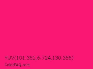YUV 101.361,6.724,130.356 Color is a normal rose color and the nearest color is Vivid Raspberry #ff006c. Hex code #fa1773 and RGB value is rgb(250,23,115). In RGB color space, this color is composed of 98% red, 9% green, 45% blue, In CMYK color space, this color is composed of 0% cyan, 91% magenta, 54% yellow , 2% black , In HSL color space, this color has a hue angle of 336° , 96% saturation and 54% lightness.