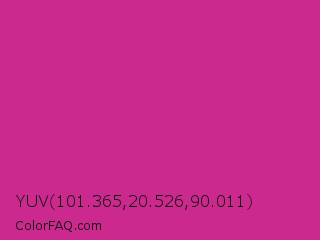 YUV 101.365,20.526,90.011 Color is a normal magenta color and the nearest color is Royal Fuchsia #ca2c92. Hex code #cc298f and RGB value is rgb(204,41,143). In RGB color space, this color is composed of 80% red, 16% green, 56% blue, In CMYK color space, this color is composed of 0% cyan, 80% magenta, 30% yellow , 20% black , In HSL color space, this color has a hue angle of 322° , 67% saturation and 48% lightness.