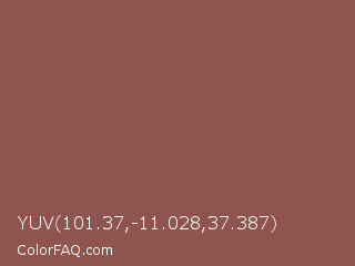 YUV 101.37,-11.028,37.387 Color is a normal red color and the nearest color is Spicy Mix #8b5f4d. Hex code #90544f and RGB value is rgb(144,84,79). In RGB color space, this color is composed of 56% red, 33% green, 31% blue, In CMYK color space, this color is composed of 0% cyan, 42% magenta, 45% yellow , 44% black , In HSL color space, this color has a hue angle of 5° , 29% saturation and 44% lightness.