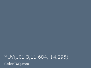 YUV 101.3,11.684,-14.295 Color is a normal blue color and the nearest color is Paynes Grey #536878. Hex code #55697d and RGB value is rgb(85,105,125). In RGB color space, this color is composed of 33% red, 41% green, 49% blue, In CMYK color space, this color is composed of 32% cyan, 16% magenta, 0% yellow , 51% black , In HSL color space, this color has a hue angle of 210° , 19% saturation and 41% lightness.
