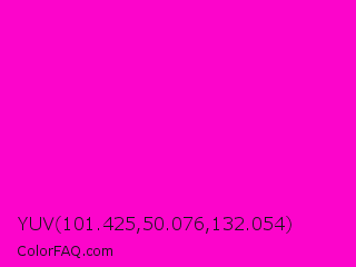 YUV 101.425,50.076,132.054 Color is a normal magenta color and the nearest color is Purple Pizzazz #ff00cc. Hex code #fc05cb and RGB value is rgb(252,5,203). In RGB color space, this color is composed of 99% red, 2% green, 80% blue, In CMYK color space, this color is composed of 0% cyan, 98% magenta, 19% yellow , 1% black , In HSL color space, this color has a hue angle of 312° , 98% saturation and 50% lightness.